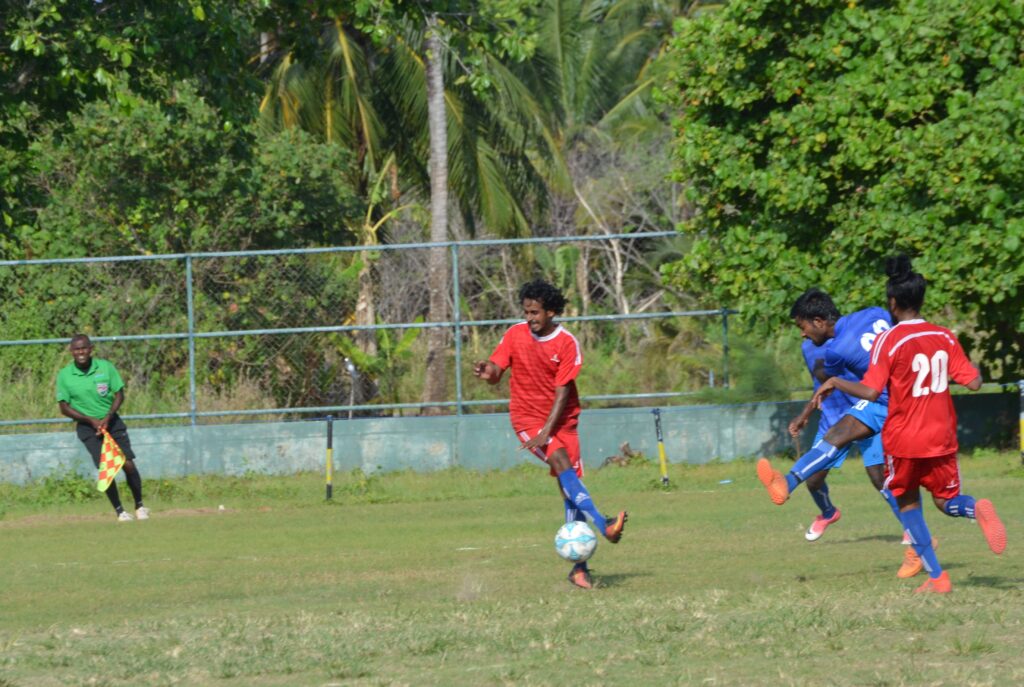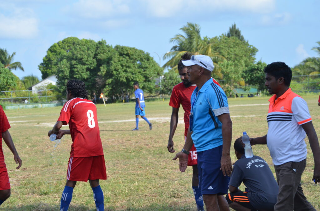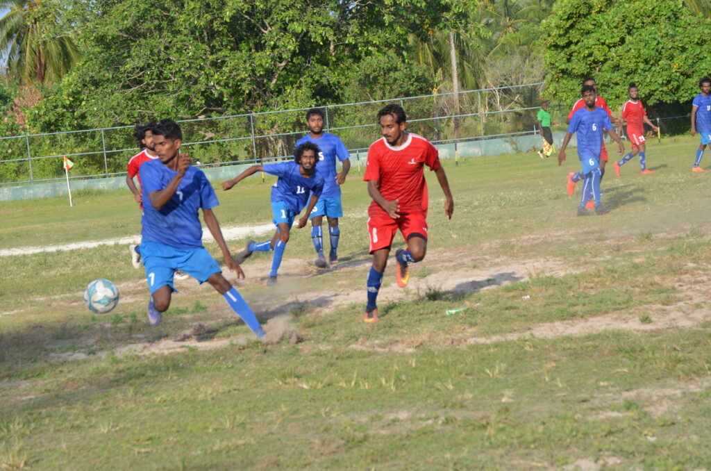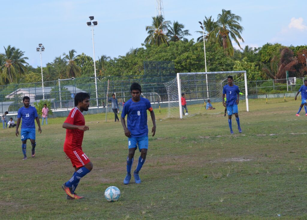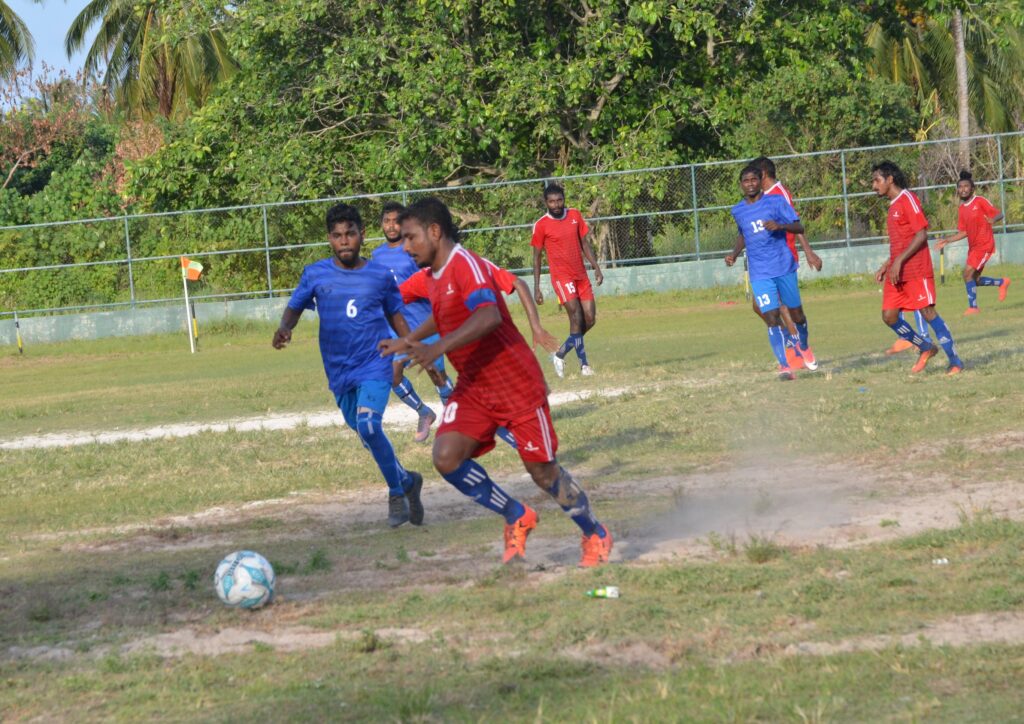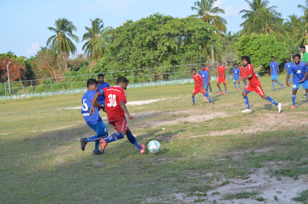 ލ.ގަމު ޓީމުގެ ކުޅުންތެރިޔާ އިދިކޮޅު ޓީމުގެ ކުޅޫންތެރިޔާ ޖެހި ބޯޅަ ދިފާއު ކުރަނީ