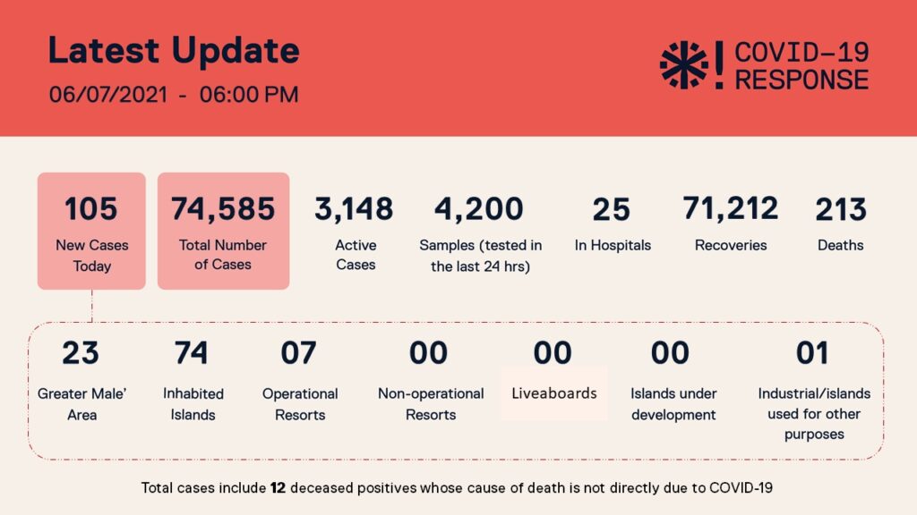 ފާއިތުވި 24 ގަޑިއިރުގެ ރާއްޖޭގެ ކޮވިޑް ހާލަތު ހާމަކުރުމަށް ކޮންމެ ރެއަކުވެސް ނެރޭ ހިސާބުތަކުގައި މިރޭގެ ހިސާބުތަކުން ދައްކާގޮތުގައި ފާއިތުވި 24 ގަޑިއިރުތެރޭގައި 4200 ސާމްޕަލް ނަގާފައިވާއިރު މުޅި ރާއްޖެއިން ފައްސިވެފައި ވަނި ޖުމްލަ 105 މީހުންނެވެ. އެއީ ގްރޭޓަރ މާލެ އޭރިއާއިން 23 މީހުންނާއި މީހުން ދިރިއުޅޭ ރަށްތަކުން 74 މީހުންނެވެ. އަދި މިހާރު ހިންގަމުންދާ ރިސޯޓުތަކުން 7 މީހަކު ފައްސިވެފައިވާއިރު އިންޑަސްޓްރިއަލް ރަށްތަކުން ފައްސިވެފައި ވަނި އެންމެ މީހެކެވެ.