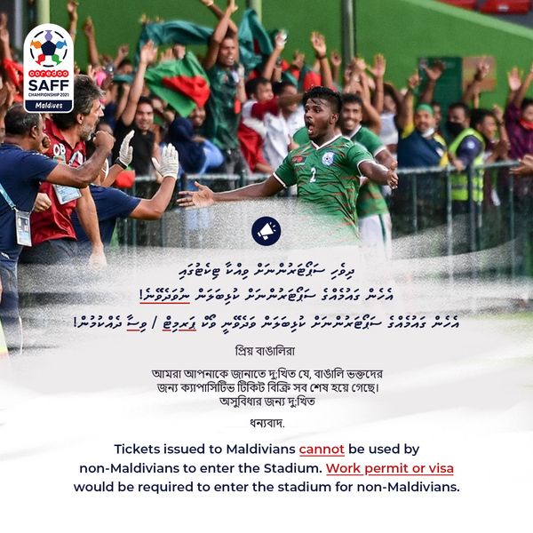 ފުޓްބޯޅަ އެސޯޝިއޭޝަން އޮފް މޯލްޑިވްސް (އެފްއޭއެމް) ނެރުނު ބަޔާނެއްގައި ބުނެފައިވަނީ މި މުބާރާތައް ޤަވައިދު ހަދާފައިވަނީ ސާކް ގެ ހުރިހާ ގައުމުތަކެއްގެ މަޝްވަރާގެ މަތިން އެއްބަސްވެފައިވާ ގޮތަށްކަމަށާ އެގޮތުން ރާއްޖެ ކުޅޭ މެޗްތަކުގައި އަވޭ ޓީމަށް ވިއްކުމަށް ކަނޑައެޅިފައިވަނީ 20 ޕަސަންޓްގެ ޓިކެތް ކަމަށާ، އެއީ 200 ޓިކެޓް ކަމަށެވެ. އެހެންކަމުން ދިވެހި ސަޕޯޓަރުންނަށް ވިއްކުމަށް ކަނޑައަާފައިވާ ޓިކެޓަކަށް ބިދޭސީ ސަޕޯޓަރަކަށް ނުވަދެވޭނެކަމަށެވެ. ހަމަ އެގޮތަށް ބިދޭސީ ސަޕޯޓަރުންނަށް ވިއްކާ ޓިކެޓަކަށް ދިވެހި ސަޕޯޓަރުންނަށްވެސް ނުވަދެވޭނެކަމަށެވެ. އެހެންނަމަވެސް ކަޅު ބާޒާރުގައި ޓިކެޓް ވިއްކަމުން އަންނަ އަންނަކަމުގެ ޝަކުވާތައް އެ އެސޯސިއޭޝަން އަށް ލިބިފައިވާކަމަށެވެ.