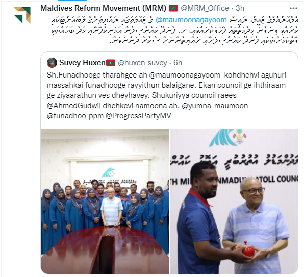 އެމްއާރުއެމްއިންވެސް ވަނީ ރައީސް މައުމޫންގެ ޚިދުމަތްތައް ބަލައިގަނެ ފުނަދޫ ރައްޔިތުންނާއި ކައުންސިލުން ބެހެއްޓެވިގައިކަން ފާހަގަކޮށް ފުނަދޫގެ ރައްޔިތުންނަށާއި ކައުންސިލަށް ޝުކުރު އަދާކޮށްފައެވެ.